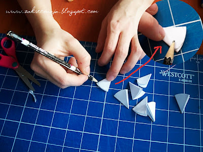 14. płatek po drugiej stronie wycietego naciąga tak by nałożył się na ten z klejem, powstaje taki zamknięty już kwiatek ( jak nasze polne białe dzwoneczki:))
